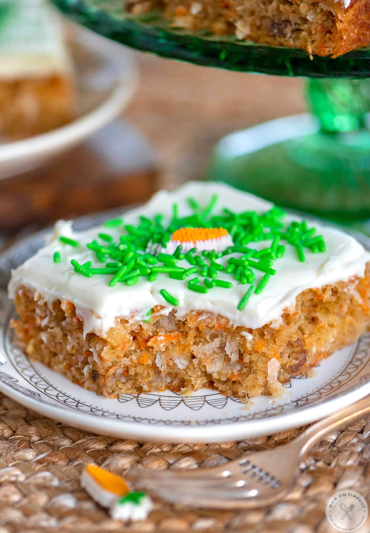My Nana used to always make her carrot cake in a 9ร13 baking dish. I took it one step further and made it in a 10 x 15 jelly roll pan. The bars take a little less time to bake and slathering the frosting on top is a breeze.